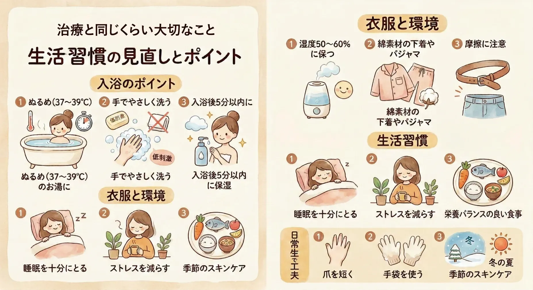 皮脂欠乏性湿疹では、薬だけでなく、日常生活の工夫や見直しが再発を防ぐカギです。ここでは、もっとも大切なポイントをお伝えしていきます。